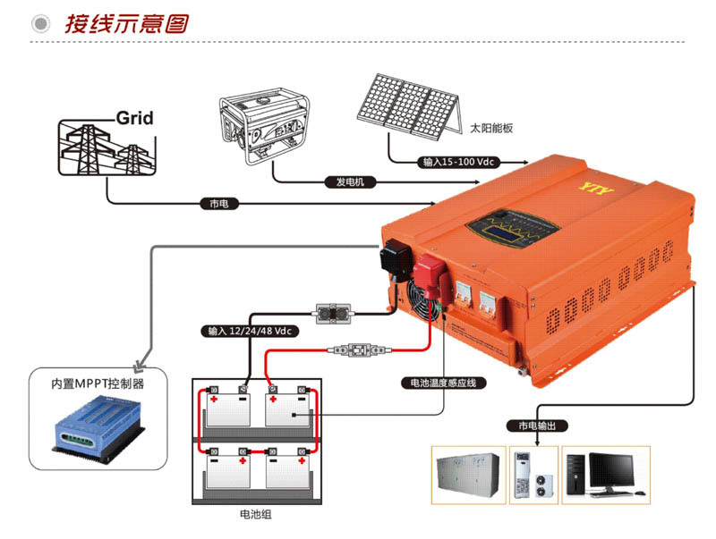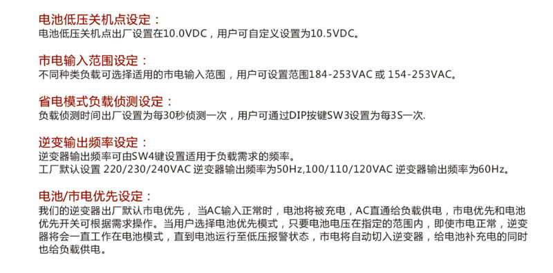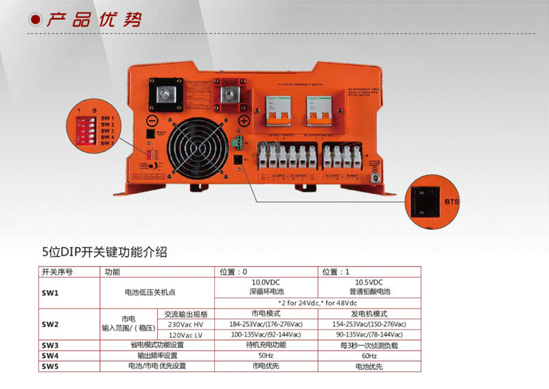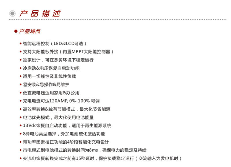 產(chǎn)品簡介: 一元48VDC 380VAC三相儲能逆變器100%支持三相不平衡;可同時帶單相負載及三相負載,支持三相不平衡。過載能力可高達額定功率300%(持續(xù)20秒),內(nèi)置大電流充電器,充電電流0-100%可調(diào)。內(nèi)置過載、短路、過壓、欠壓、過溫等保護功能,市電模式到電池模式的轉(zhuǎn)換時間為8ms,確保電力的穩(wěn)定及持續(xù),根據(jù)負載類型可選輸入市電壓范圍(318-438V或266-438V)。